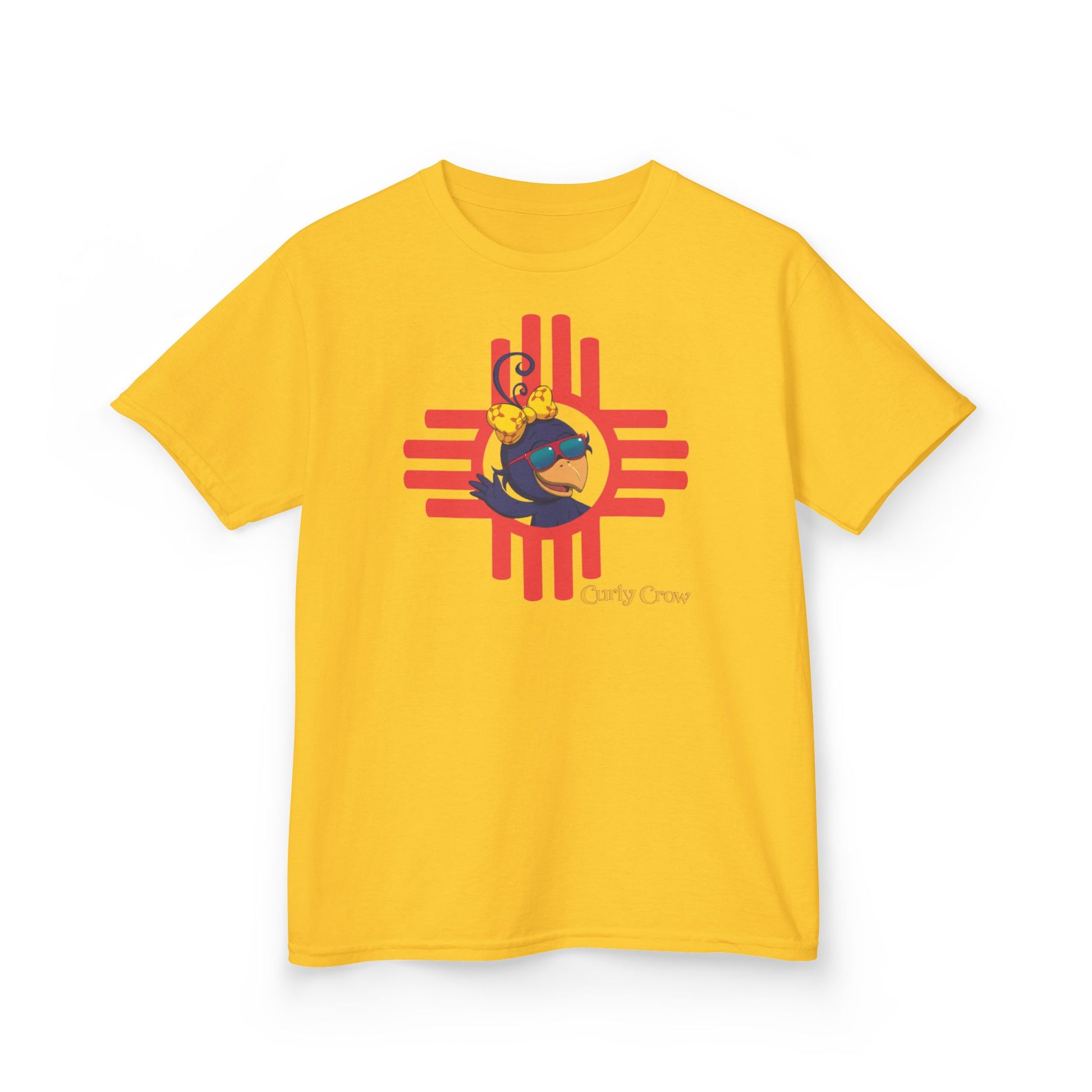 Curly Crow is here to bring some fun to your wardrobe! This playful design features Curly Crow happily waving from inside the iconic NM Zia symbol—because nothing says "Land of Enchantment" like a little adventure! Perfect for Curly Crow fans and proud New Mexicans alike, this tee is a must-have.