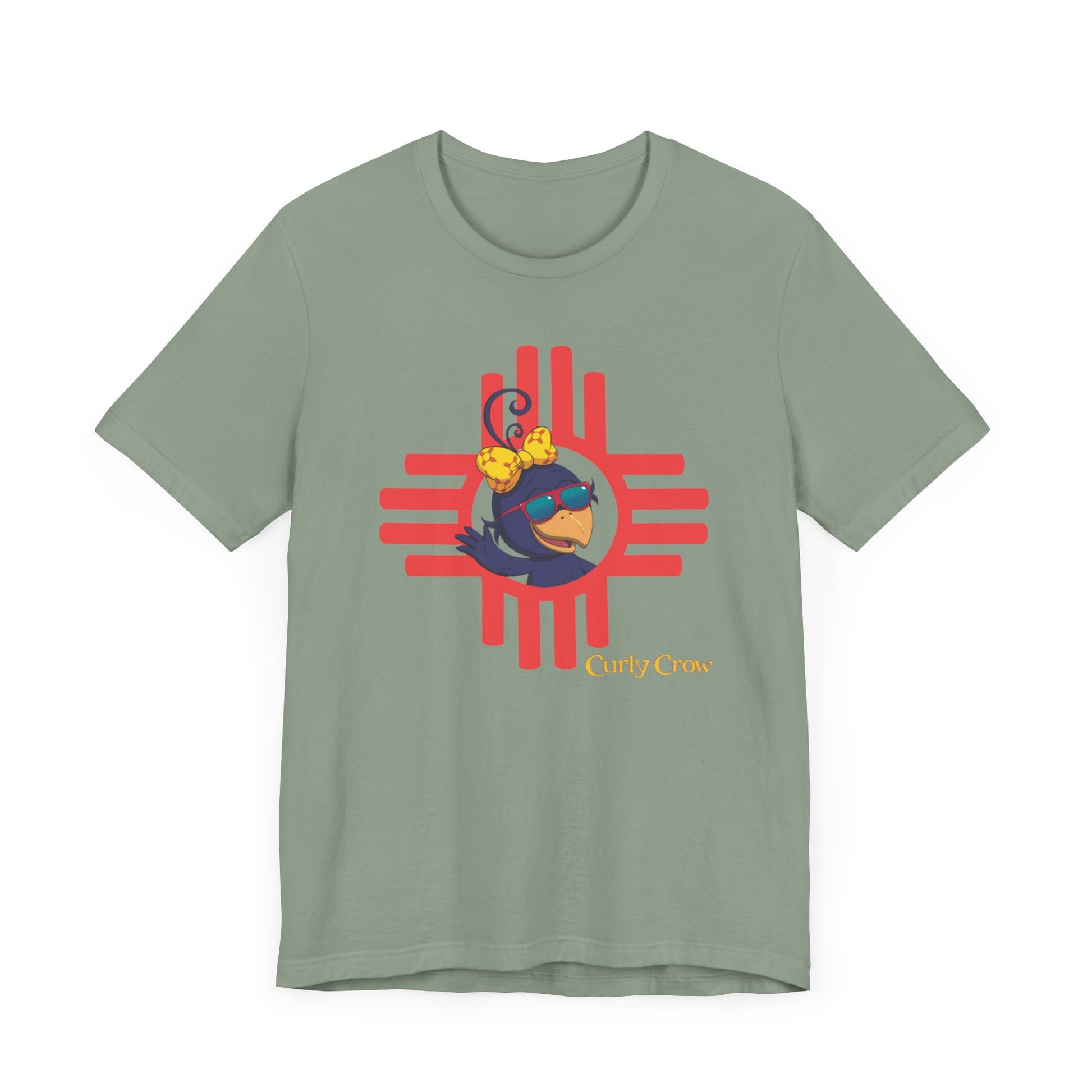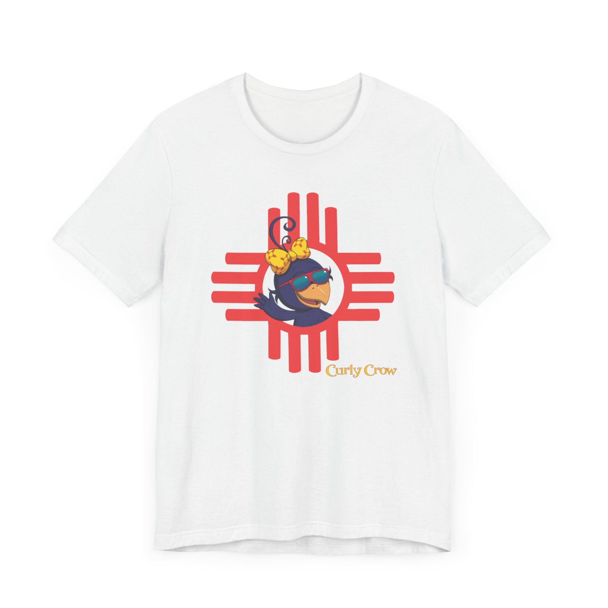 Curly Crow is here to bring some fun to your wardrobe! This playful design features Curly Crow happily waving from inside the iconic NM Zia symbol—because nothing says "Land of Enchantment" like a little adventure! Perfect for Curly Crow fans and proud New Mexicans alike, this tee is a must-have.